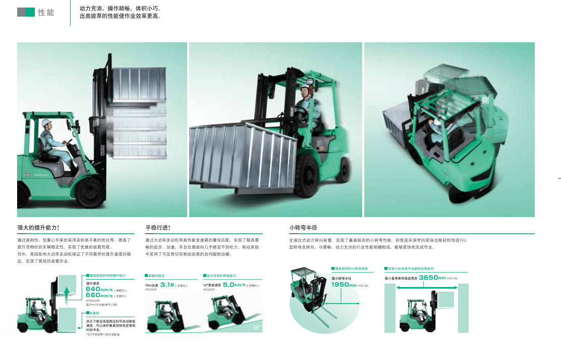 三菱叉車 GRENDIA 叉車 性能強大的提升能力!通過高剛性.低重心車秦的采用及機體平衡約優(yōu)化等,提高了提升貨物時的車輛穩(wěn)定性,實現(xiàn)了優(yōu)優(yōu)越的裝載性能。另外、高扭矩和大功率發(fā)動機保證了不同載荷時提升速度的穩(wěn)定,實現(xiàn)了高效的裝載作業(yè)。平穩(wěn)行進通過大功率...