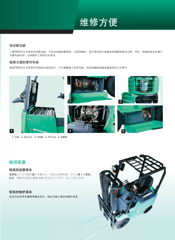 維修方便自診斷功能三菱FB系列叉車具有自診斷功能,可自動診斷故障原因。出現(xiàn)故障時,顯示屏?xí)@示故障信息提醒駕駛員注意。同時,故障信息會存儲于車載電腦內(nèi)存,以供維護(hù)工程師日后參考。檢修方便的零件布局新型FB系列叉車的零件布局經(jīng)過特別設(shè)計,可方便維...