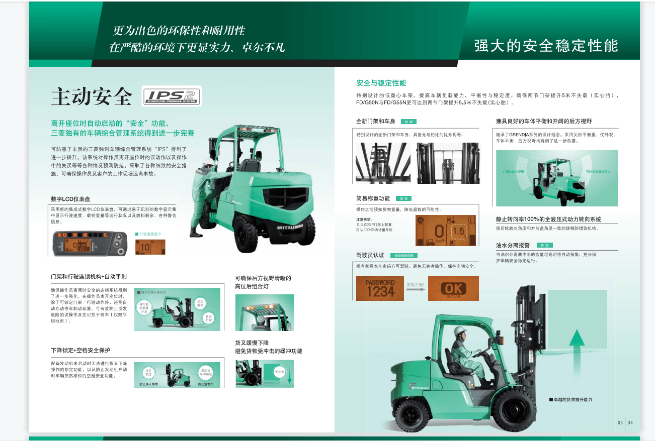 主動安全可防患于未然的三菱獨創車輛綜合管理系統-IPS-得到了 進一步提升。該系統對操作員離開座位時的誤動作以及操作 中的失誤等等各種情況預測防范,采取了各種細致的安全措 施,可確保操作員及客戶的工作現場遠離事故。數字LCDft表盤釆用新的集成式數字LCD...